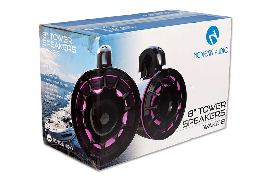 8″ marine (boat) tower speakers, 500W RMS / 1000W peak, 20Hz-20kHz, IP65 rating with RGB lighting.